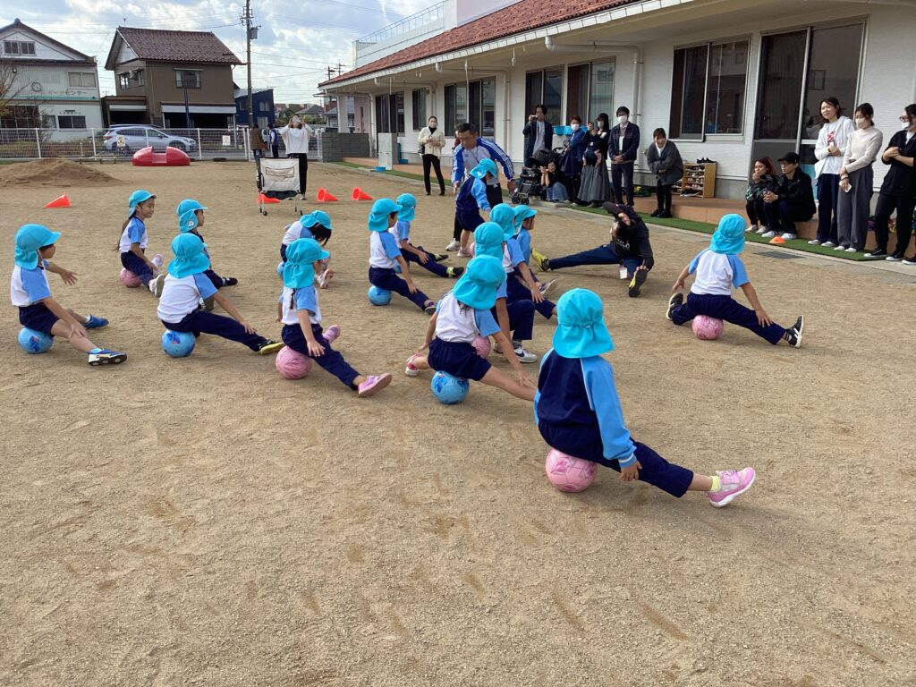5歳児さんは、ボールに乗ってバランスを取りながらの準備体操や、ボールを持って走る準備体操をしていました。