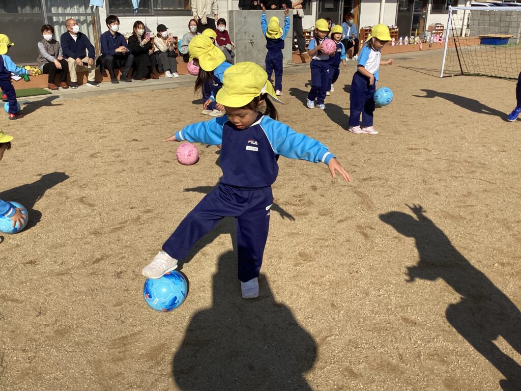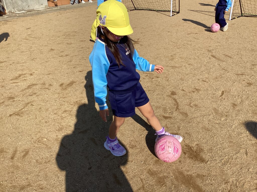 4歳児さんは、ボールを止めて蹴る練習をしていました。