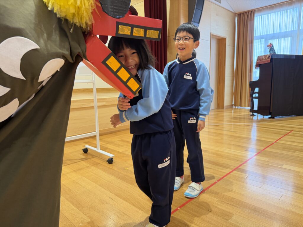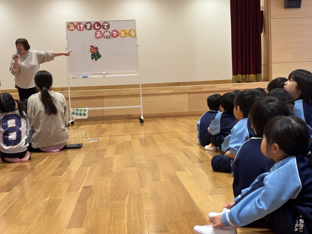1月9日にこども新年会がありました。お正月のお話を聞いた後、「獅子舞」の話を聞きました。