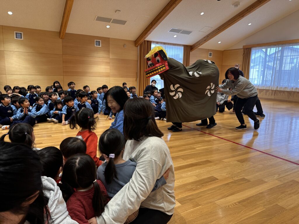 獅子舞の可愛いイラストや怖いイラストを見た後に写真の獅子舞を見ると、ちょっと怖かったのか涙が出てしまうお友達も見られました。そんな時に、音楽が流れて・・・