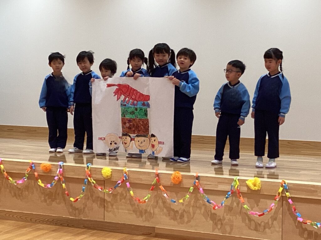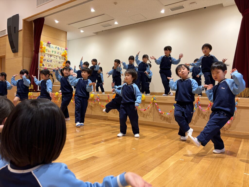 4歳児さんからは、5歳児さんと一緒に楽しんだ「おもいで」を発表してくれました。春、夏、秋、冬。一年を通して5歳児さんとの楽しかったことをみんなで絵に描いて、発表しました。発表の最後には、5歳児さんが発表会で踊った「ツバメ」のダンスを踊って見せてくれました。一人一人とてもリズミカルに踊っていました。会場のお友達も大盛り上がりでした。