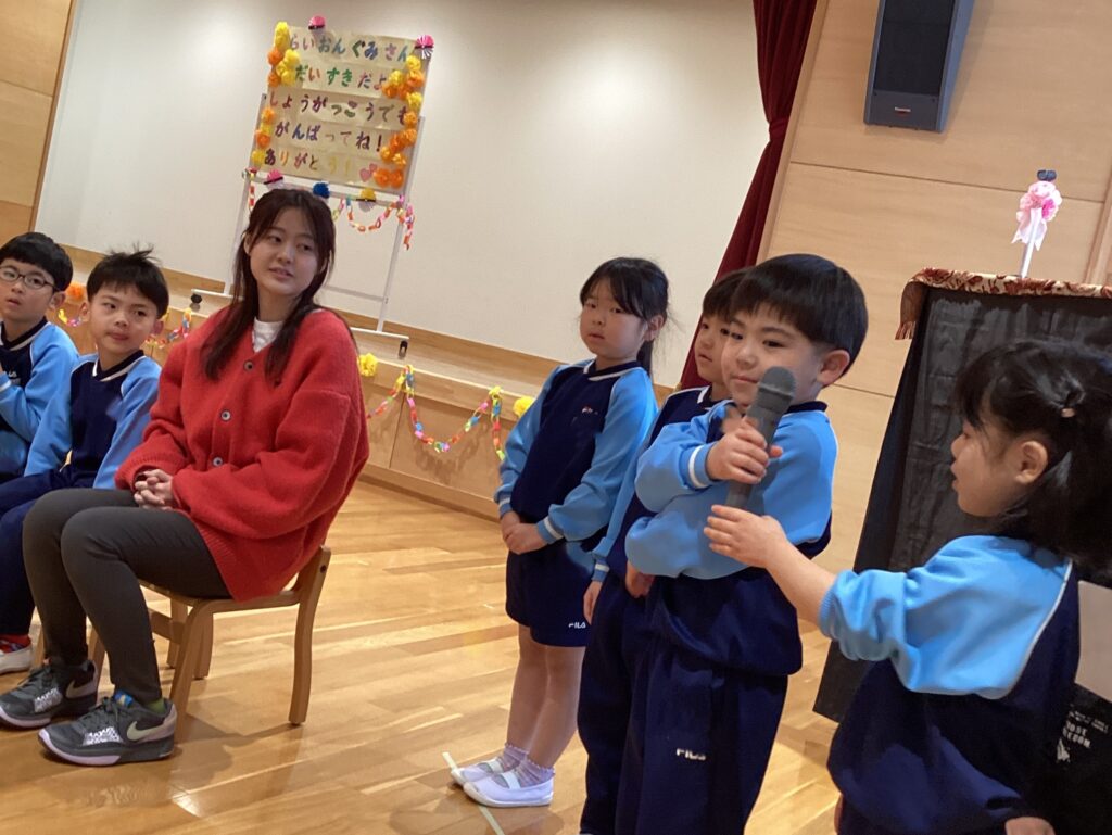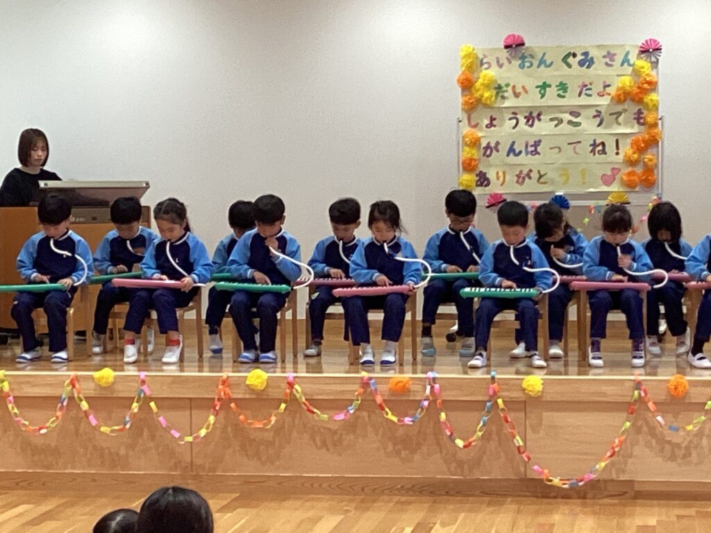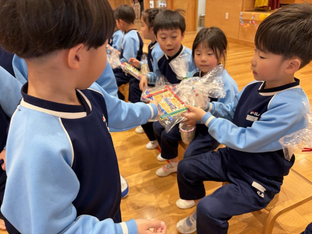 最後に、在園児さんから5歳児さんにプレゼントを渡しました。みんなが一生懸命に作ったプレゼントを喜んで受け取ってもらえました。