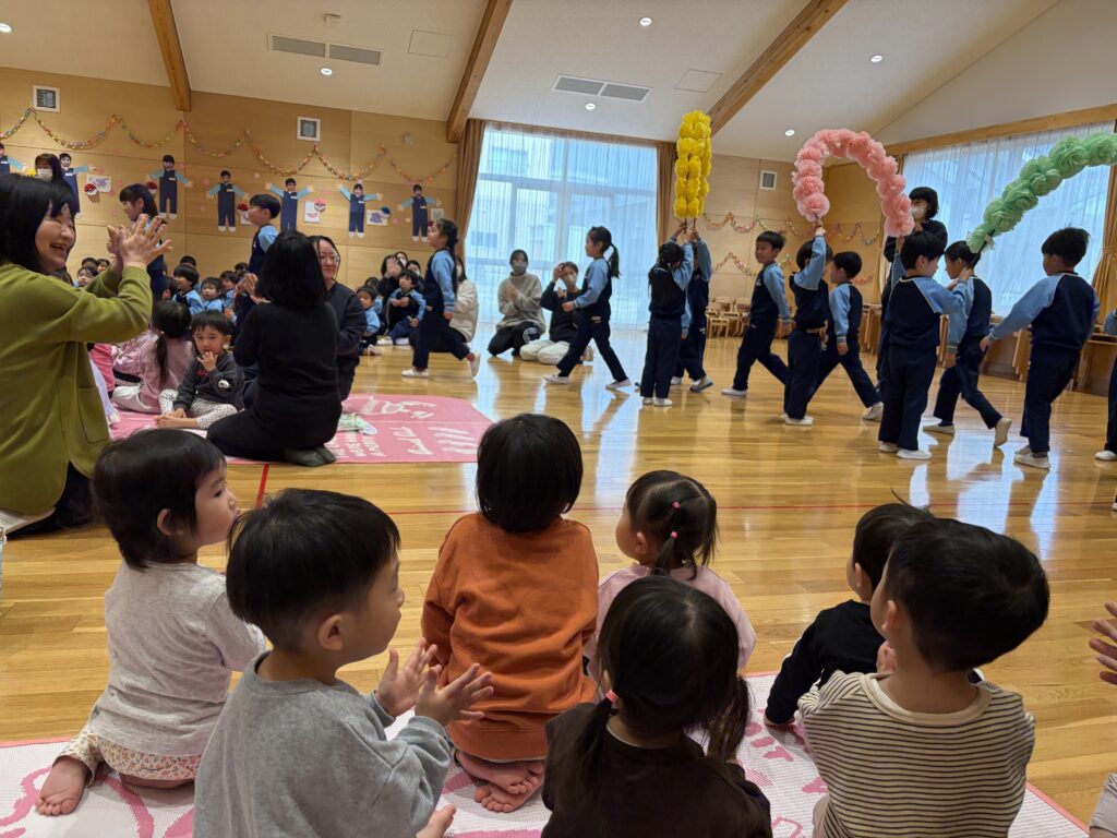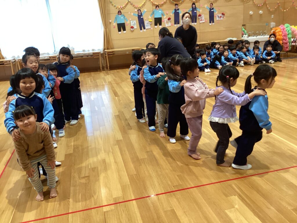 2歳児さんと3歳児さんは、一緒に「ジャンケン列車」を楽しみました。ジャンケンがまだ分からないお友達には、5歳児さんが優しく教えてくれました。