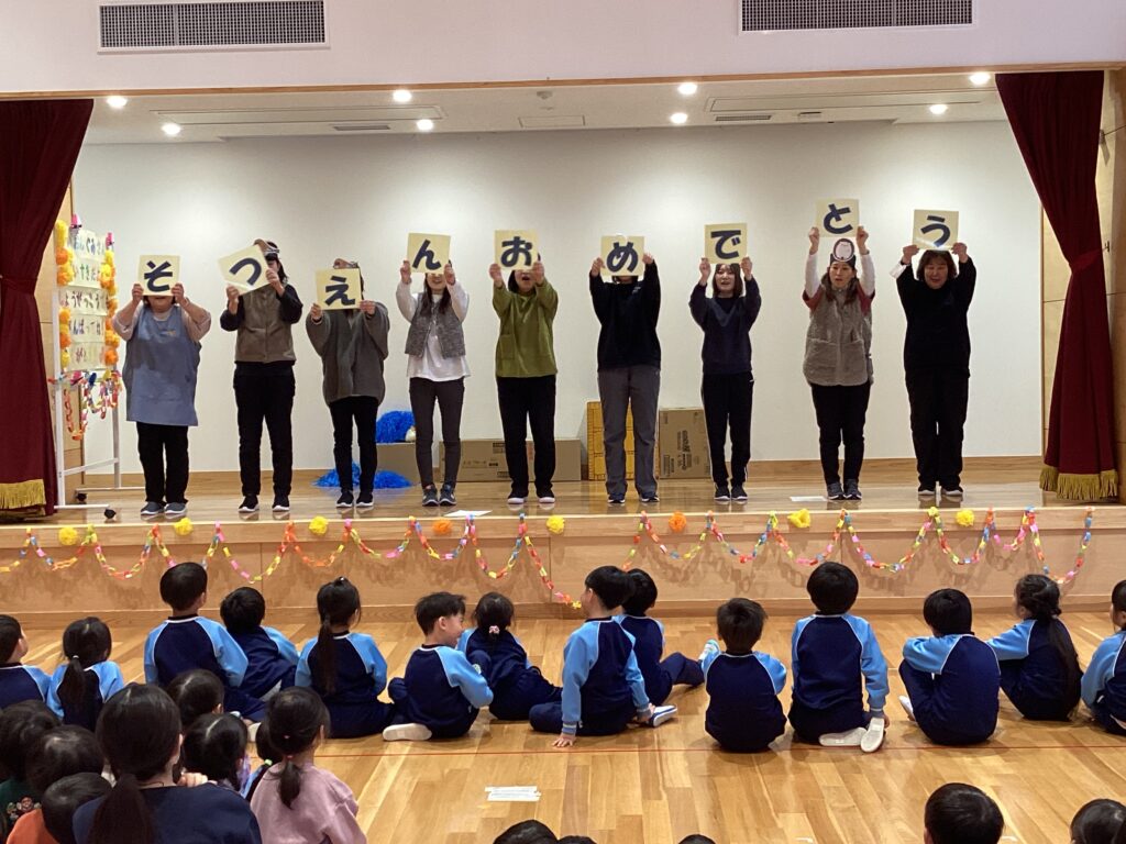 先生達からのプレゼントは、5歳児さんが発表会で演じてくれた「くすのきだんちは10かいだて」の劇をしました。先生達の熱演に、子供達も大喜びでした。
