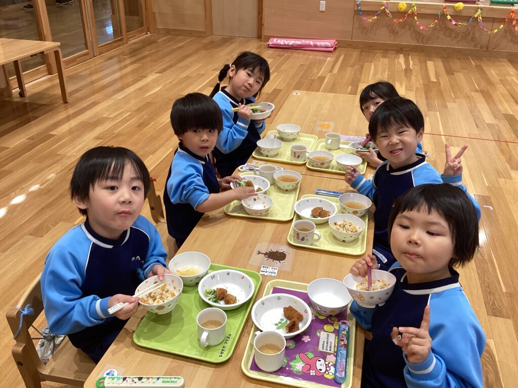 給食は3歳児・4歳児・5歳児さんで遊戯室で食べました。いつもと違う雰囲気、いつもと違うお友達で給食をおいしく頂きました。