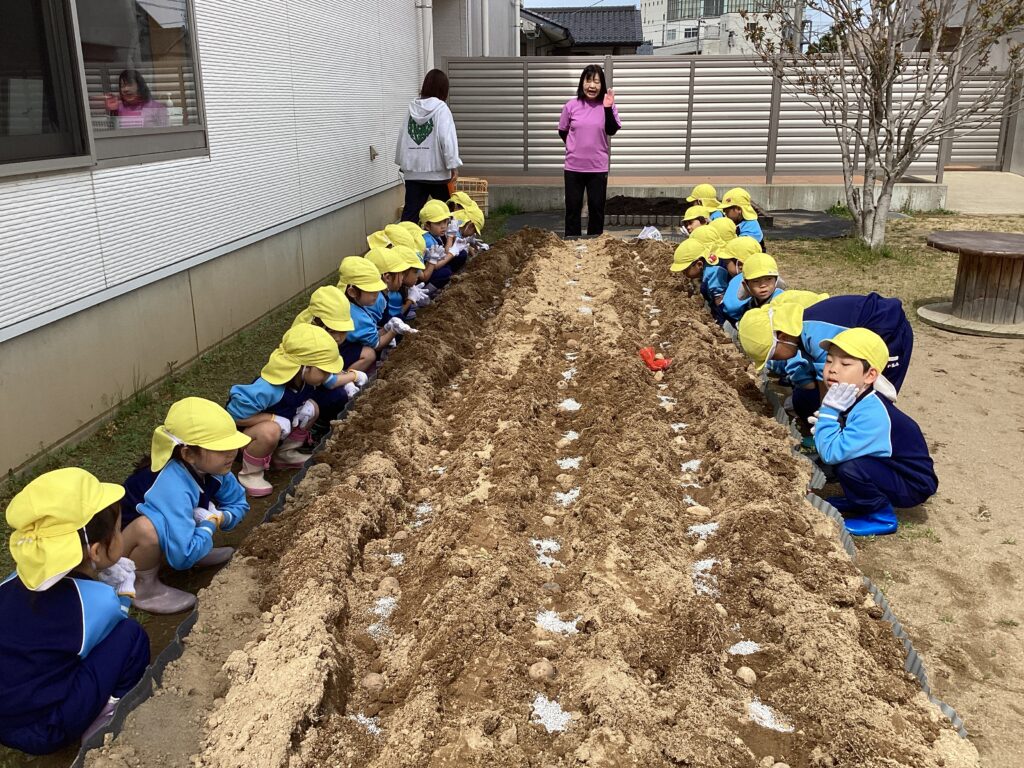 お天気のいい日を見計らっていよいよみんなで作った畑でのじゃが芋植えのスタートです。みんな待ちに待ったというような思いに溢れていたのが園長先生はとても嬉しかったです。
