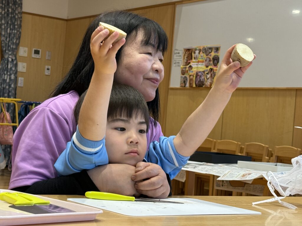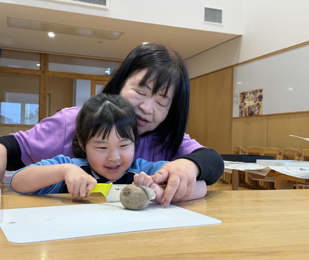 その何日か後に保育室で種芋作りをしました。ワクワクドキドキ⁉ 種芋を芽が2つ以上残るように包丁で一人づつ切ります。今年は3種類「きたあかり」「だんしゃく」「メークイン」を植えます。みんなで名前を呼称して種類の違いを見てみました。
