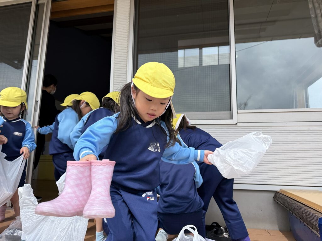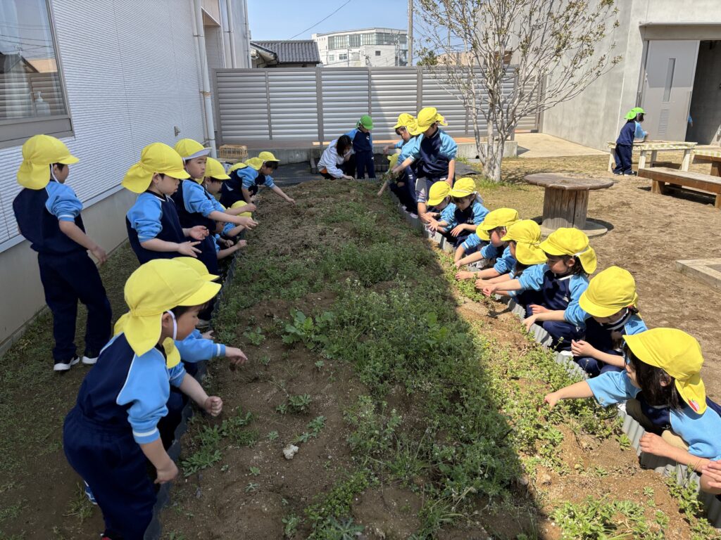 ぎゅっと草を抜いて土をトントン落として袋に入れる。という一連の作業を繰り返し、年長になってみんなでする最初のお仕事が草取りでした。草の多さに心配していましたがさすが30名だと思ったより早くとてもきれいに草取りを終えることができました。「みんなでやるとすごいね!こんなにきれいになったよ。立派な畑になってじゃが芋植えが楽しみだね。」「いつ植えるの?」「早く植えようよ。」などの声が飛び交いました。