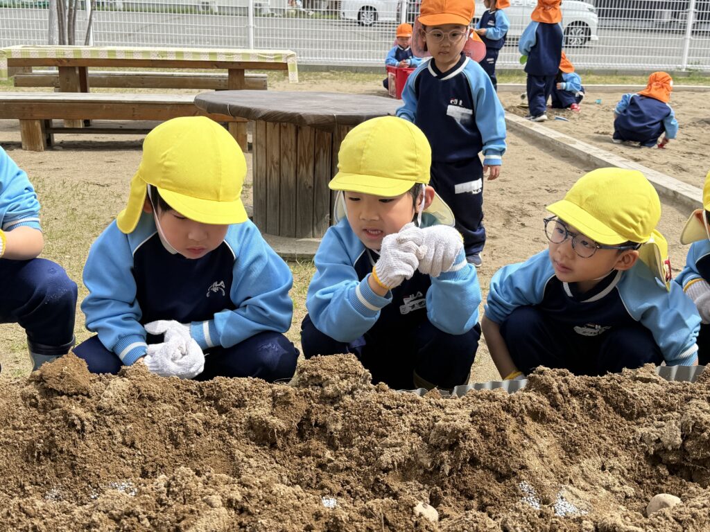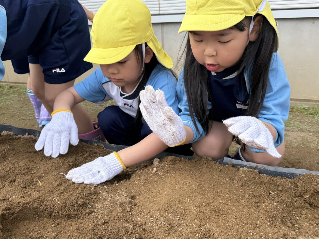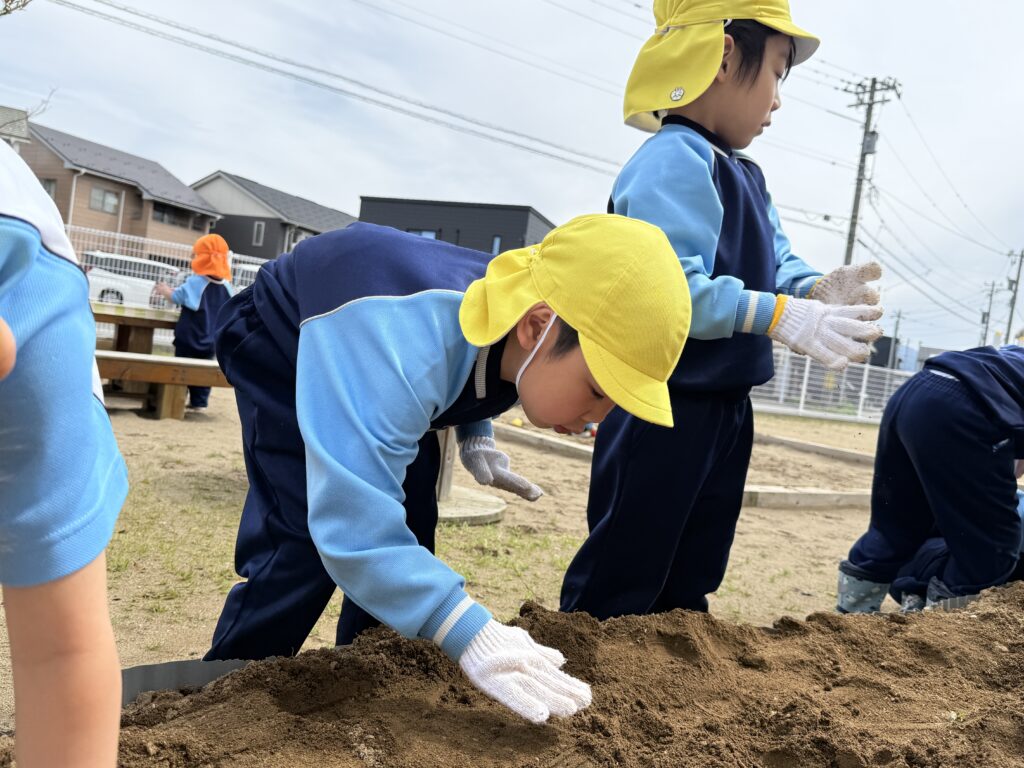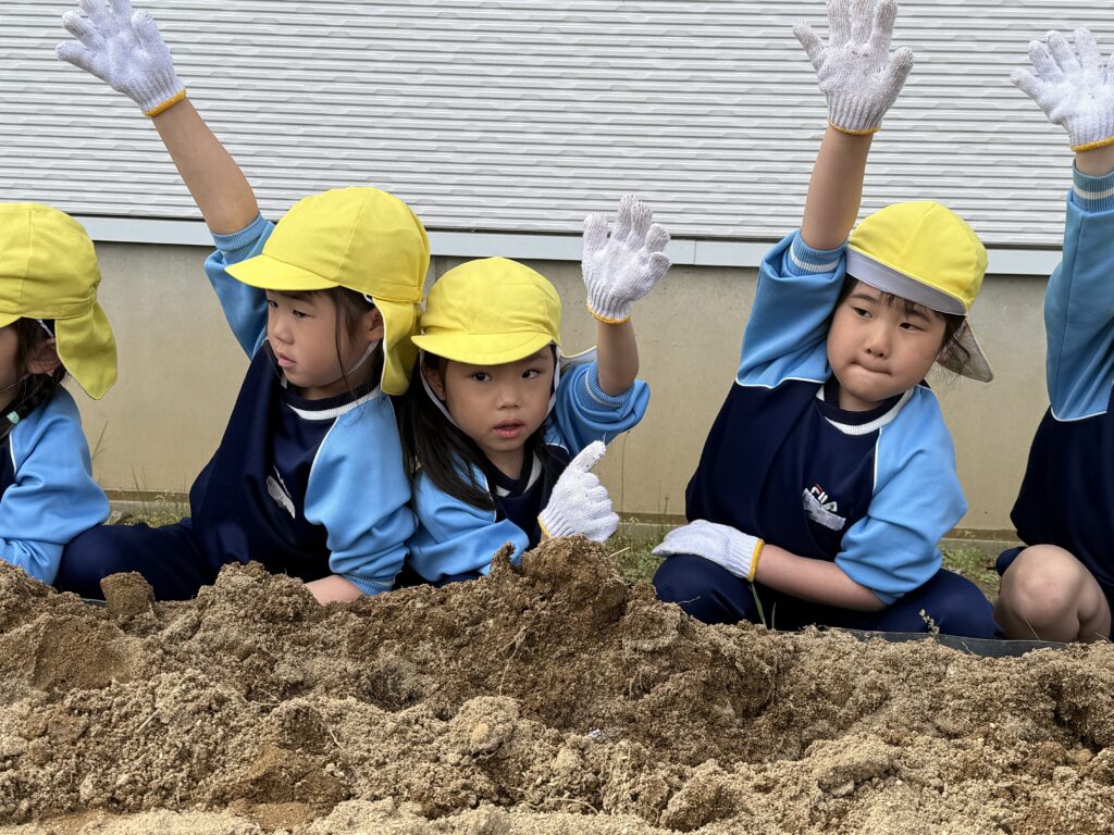 年長さんとして、小さいお友だちみんなのために一生懸命植えたじゃが芋。大きくおいしくそしてたくさんできるのが楽しみだね💕