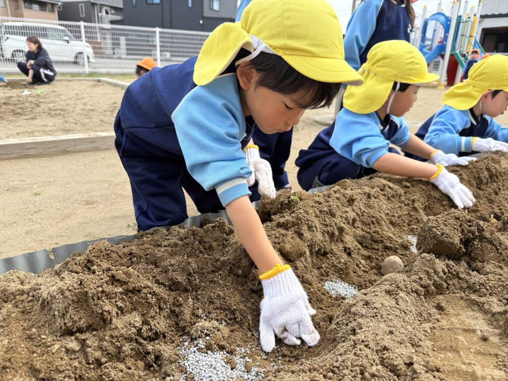 肥料にもしっかりと土をかぶせます。(しっかり話をきいていました。いいですね。)