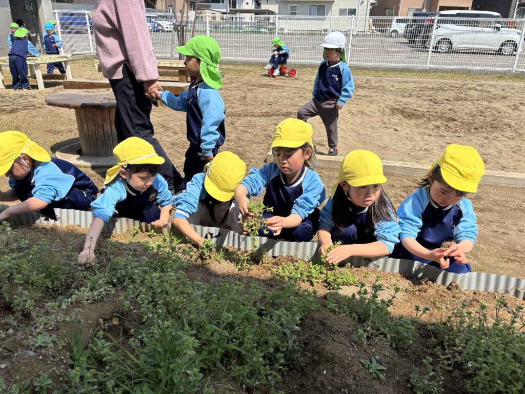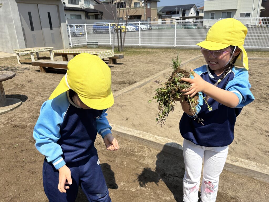 昨年の年長さんが最後の冬に育てた大根の後の草取りから始まった新年長さん。たくさんの草は、畑の栄養分を得てかどんどん育っていました。