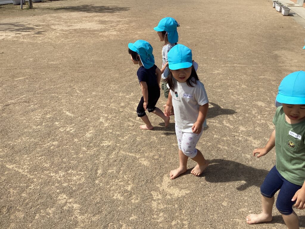 園庭に出てきたのは4歳児ぞう組さん🐘「裸足だと歩くの痛いな~」といつもと違う土の感触を足で感じながら・・・そ~っと外へ